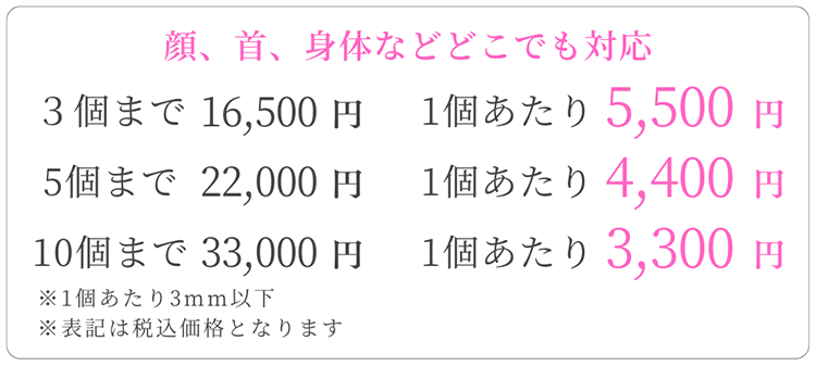 - ご希望であれば、一回の治療で何個でも除去が可能です。治療直後は凹みや赤みが出来るため、最初は目立たない部分から治療をお受け頂くこともできますが、同時に複数個除去することで、治療後のダウンタイムを短期集中するというメリットもございます。カウンセリングにてご希望をお聞かせいただきながら、治療箇所、治療個数をご相談ください。